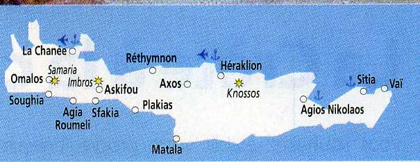 • La petite île d'Elafonissi, accessible à pied, avec l'une des plus belles plages de l'île dans un cadre enchanteur.• Les Gorges d'Imbros et de Samaria.